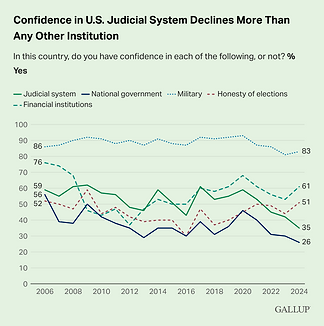 Confidence in the rule of law is foundational to a free society. However, Americans’ faith in the embodiment of the rule of law—the judicial system—has declined significantly in recent years. In 2024, only 35% of Americans expressed confidence in the honesty of the justice system. A new survey conducted by the Partnership for Public Service in the spring of 2025 shows that trust in the federal government remains low.